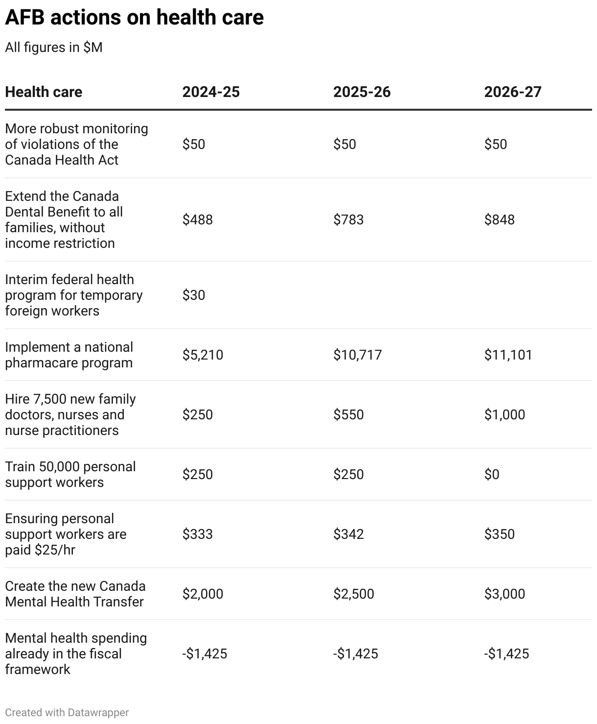 The AFB will establish the Canada Mental Health Transfer at $5.3 billion annually over five years amounting to 12 per cent of current health care budgets. This new transfer would have 50 per cent of funding earmarked for community mental health and substance use health care providers. This funding will help alleviate the strain currently placed on emergency departments and better prepare the medical care and community care systems to respond to the anticipated demand for mental health and crisis supports and programs following the launch of the 988 suicide and mental health crisis helpline.
