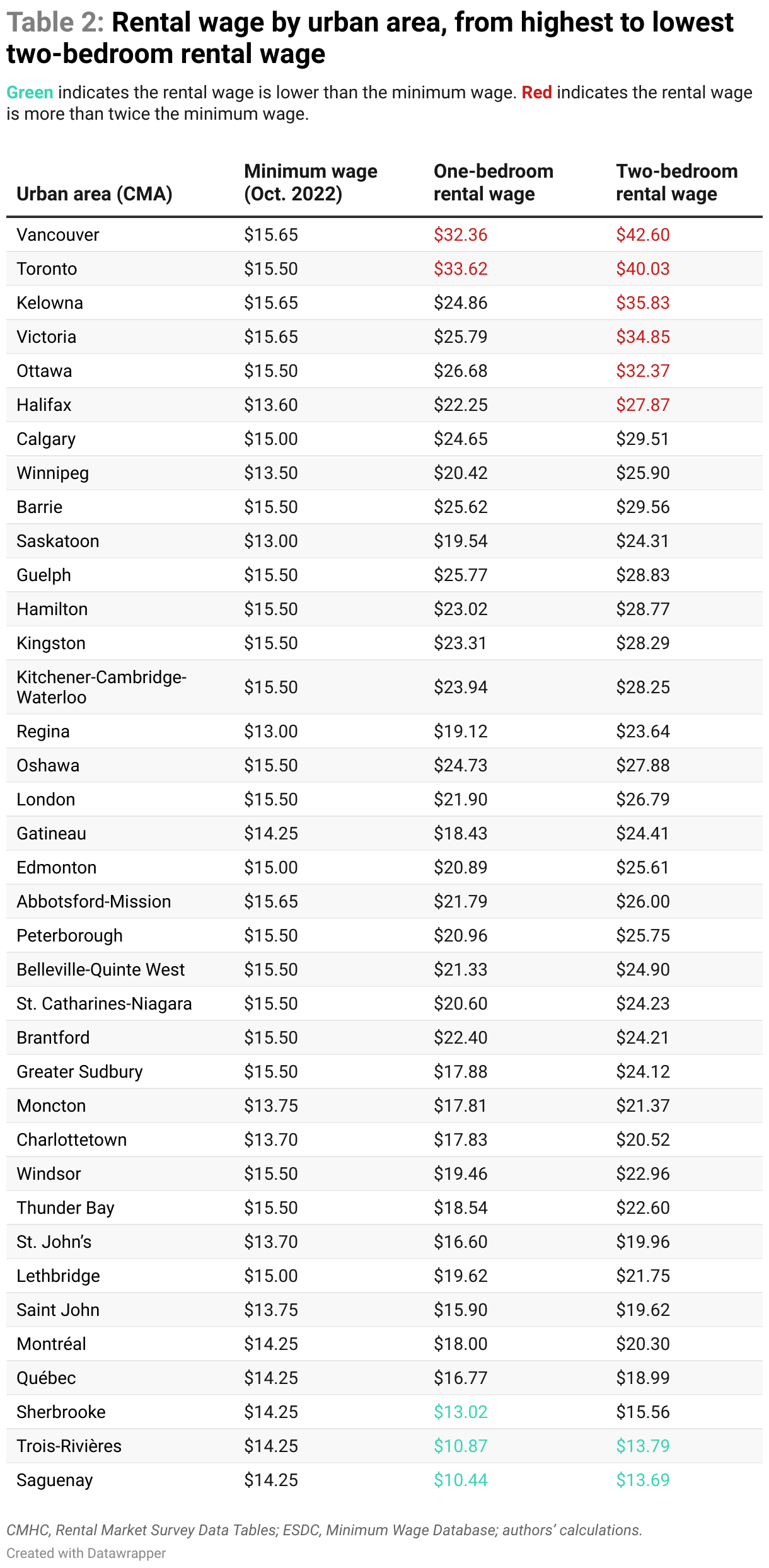 Single-earner families earning the minimum wage that require a two-bedroom apartment can only find an affordable apartment in two CMAs: Trois-Rivières and Saguenay. In the six cities with the highest two-bedroom rental wage—Vancouver, Toronto, Kelowna, Victoria, Ottawa, and Halifax—the rental wage is more than twice the minimum wage (see Table 2). In these six worst rental-wage cities, two full-time minimum wage workers cannot rent a two-bedroom without spending more than 30 per cent of their combined income on housing.