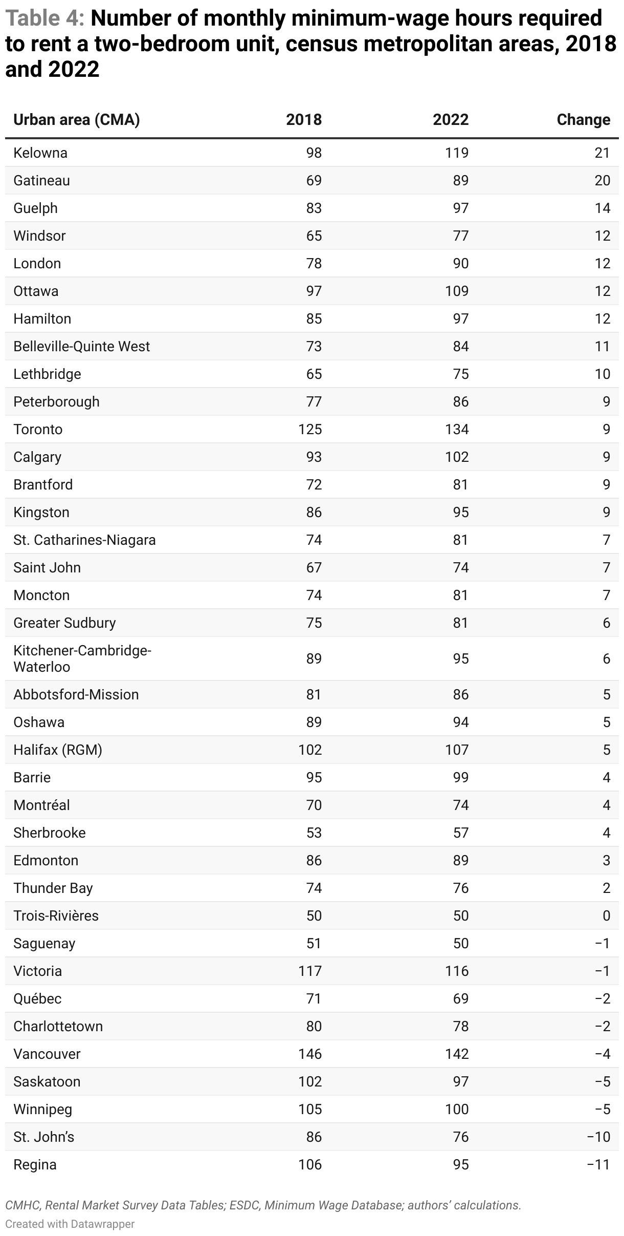 The number of minimum wage hours required to pay rents also increased in most cities since 2018. In 2022, rent consumed more hourly wages than it did before in 27 of the 37 CMAs, it remained the same in one CMA, it decreased in the remaining nine CMAs.