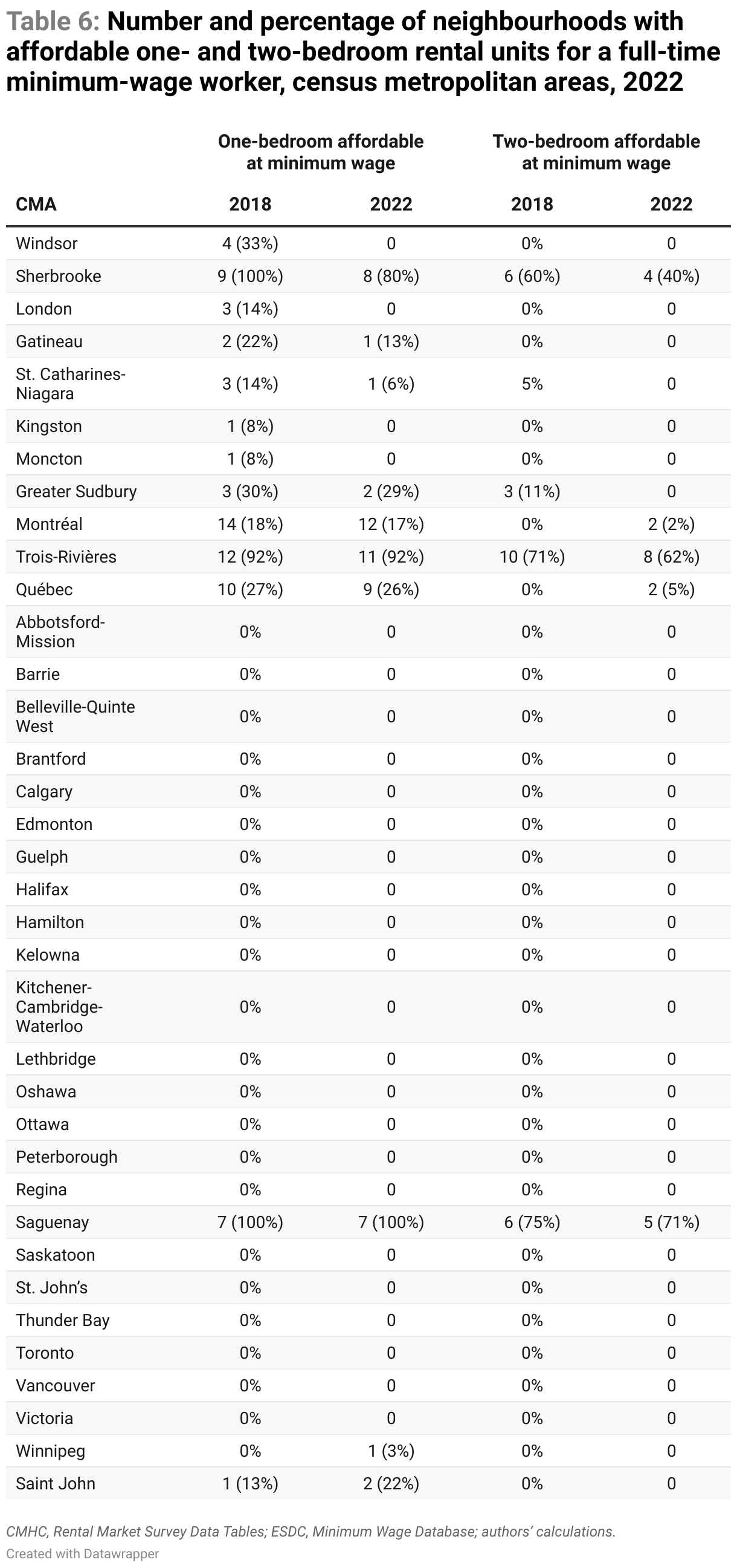 Sherbrooke and Gatineau are also in the list of cities that experienced a decrease in the share of affordable neighbourhoods, reinforcing the concern about low-wage workers being priced out of major centres in that province. Two CMAs saw an increase in the percentage of neighbourhoods with one-bedroom units at a price that minimum-wage workers can afford: Winnipeg (three per cent) and Saint John (10 per cent). In both cases, the increase was due to one neighbourhood moving above the threshold, mostly due to an increase in the minimum wage.