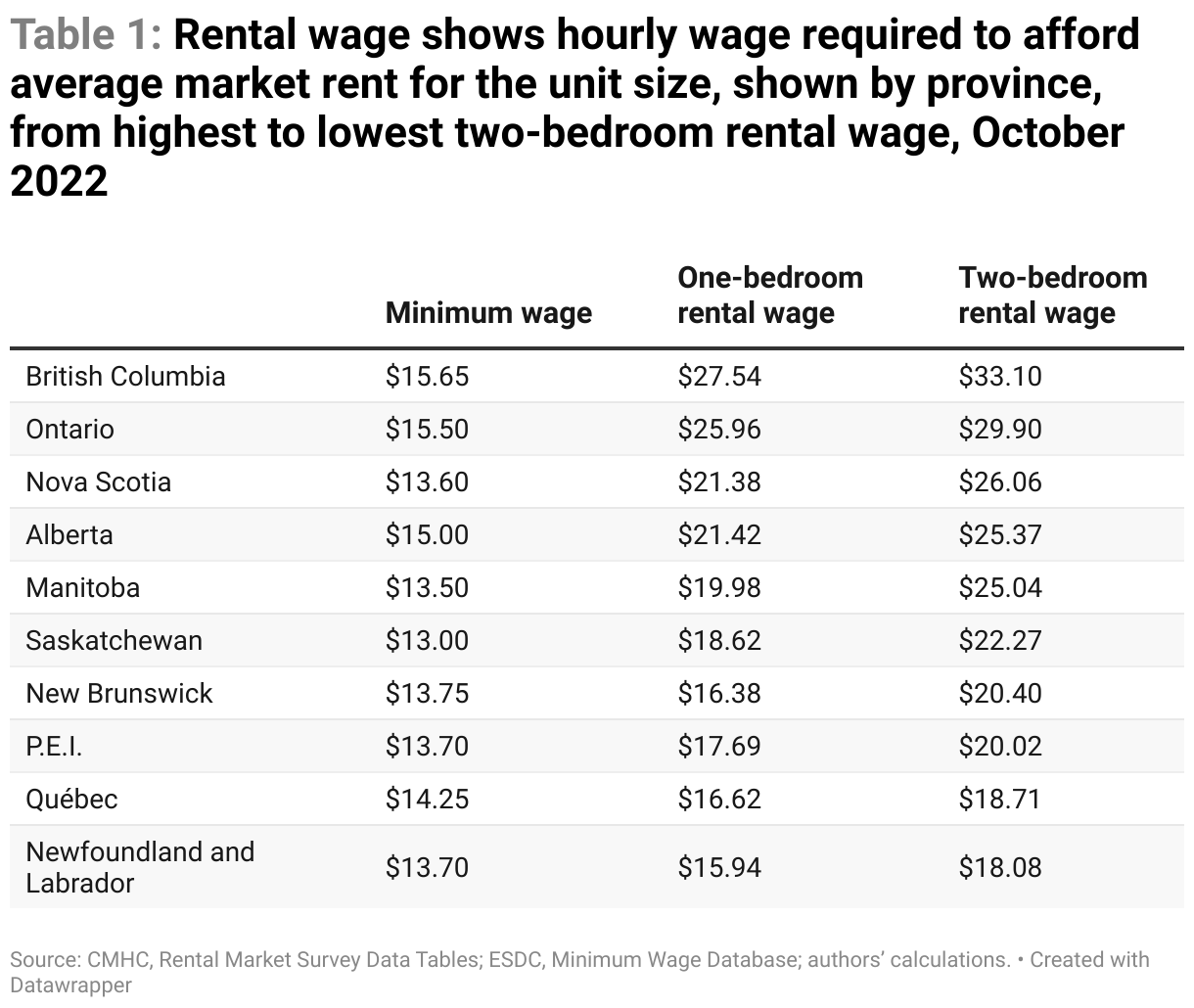 The rental wage is considerably higher than the minimum wage in every province, as seen in Table 1. The gap between the minimum wage and one-bedroom rental wages varies from $2.24 (16 per cent) in Newfoundland and Labrador to $11.89 (76 per cent) in B.C. Québec has the smallest proportional gap between the minimum wage and the two-bedroom rental wage, but even there, workers need to earn $4.46 (31 per cent) more per hour to afford a unit without spending too much of their income. In B.C. the two-bedroom rental wage is over twice as much as the minimum wage. Ontario and Nova Scotia have two-bedroom rental wages just under twice the minimum wage.