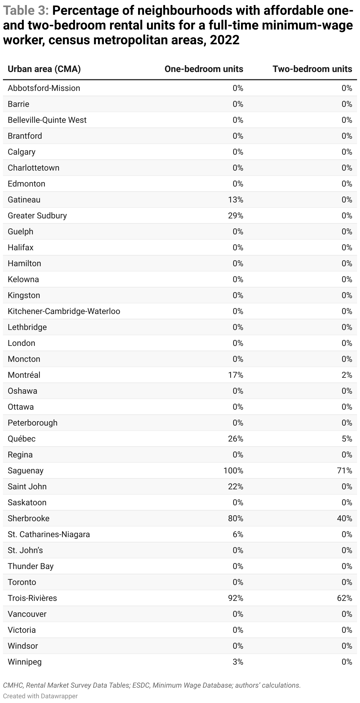 Gone are the days when exorbitant rents were a peculiarity of Toronto and Vancouver. Table 2 shows that the one-bedroom rental wage is lower than the minimum wage in only three CMAs. All are in Québec: Sherbrooke, Trois-Rivières, and Saguenay.