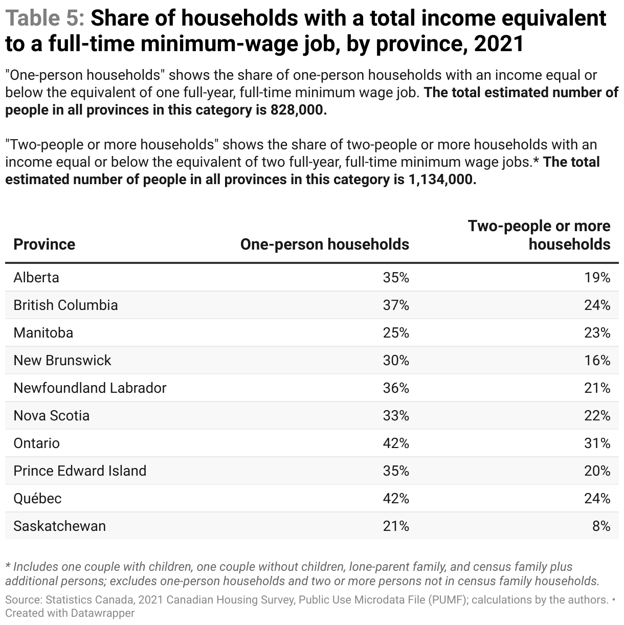 Table 5 in the Appendix presents the share of one-person households with total income at or below the equivalent of a full-year, full-time minimum-wage job in 2021. (We used 2021 wages to match the year of the Canada Housing Survey). The share varies from 21 per cent to 42 per cent, depending on the province. An estimated 828,000 people were in that situation, nationally. The same table presents the share of households of two or more people with household income at or below the equivalent of two full-year, full-time minimum-wage jobs in that province in 2021. The share varies from eight per cent to 31 per cent, depending on the province. Across the country, an estimated 459,000 households, or 1.1 million people, were in this situation. As presented below, the combined income of two people earning the minimum wage is not sufficient to afford one- or two-bedroom units in some cities. Other research has detailed the housing needs of different low-income groups.12