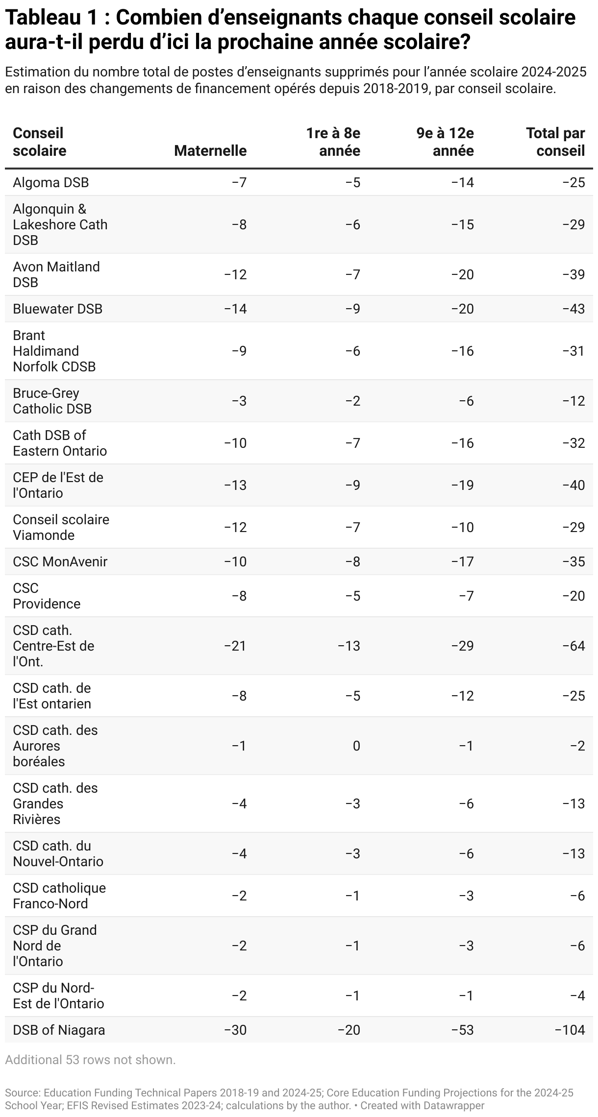 En 2024-2025, l’Ontario aura 4 990 enseignants de moins que si la formule de financement n’avait pas changé en 2018-2019. Avec la nouvelle formule, la maternelle devra s’en sortir avec 1 600 personnes en moins. Les élèves de la 4e à la 8e année auront près de 1 000 enseignants de moins. Ceux de la 9e à la 12e année en perdront près de 2 600. Le tableau 1 ci-après présente les pertes par conseil scolaire.