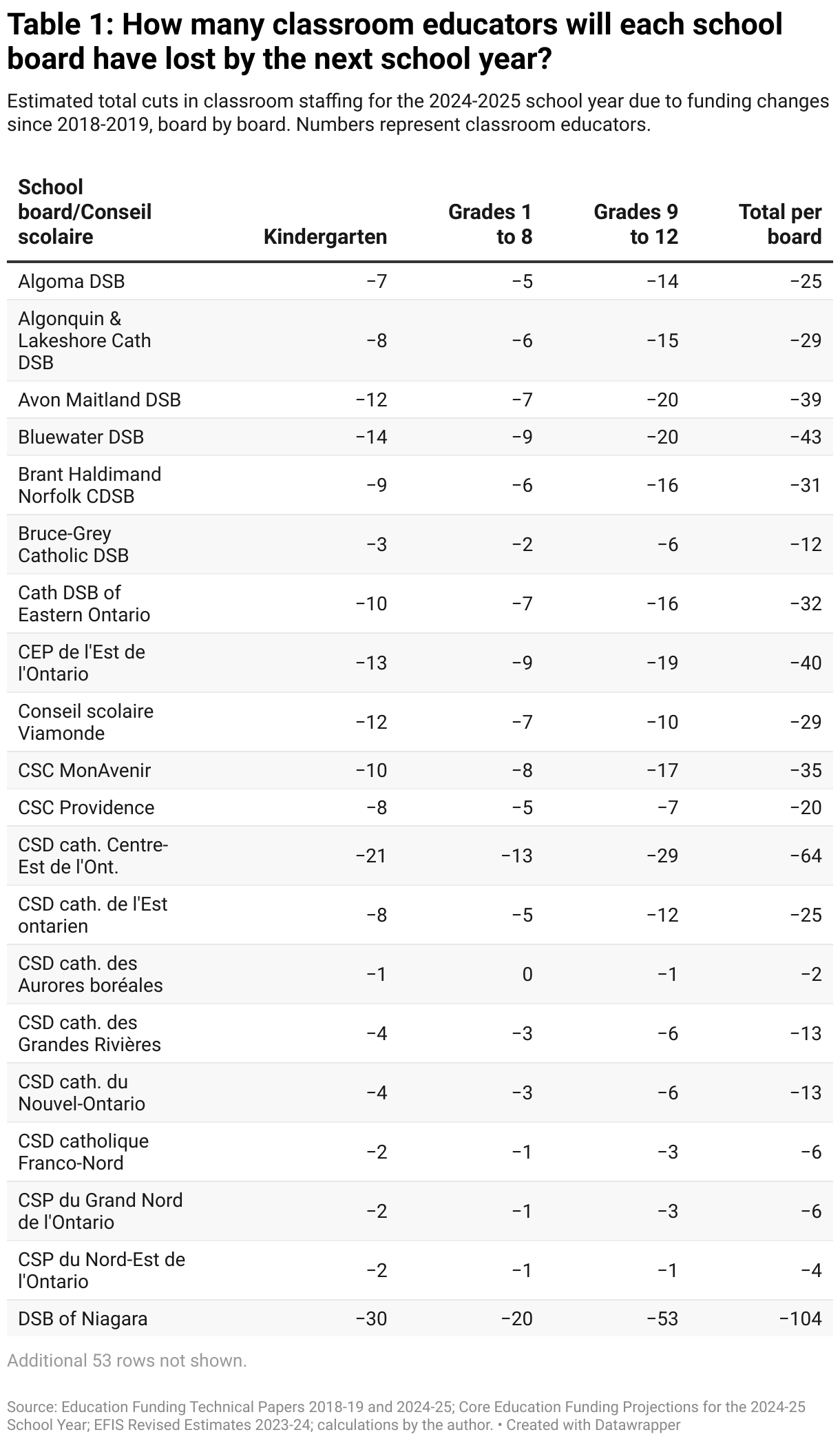 In 2024-2025, Ontario will have 4,990 fewer classroom educators than it would have had if the funding formula hadn’t changed since 2018-19. Under the new formula, kindergarten will have to make do with 1,600 fewer staff. Grades 4 to 8 will have almost 1,000 fewer staff. Grades 9 to 12 will lose almost 2,600 positions. Table 1 below presents the board-by-board losses.