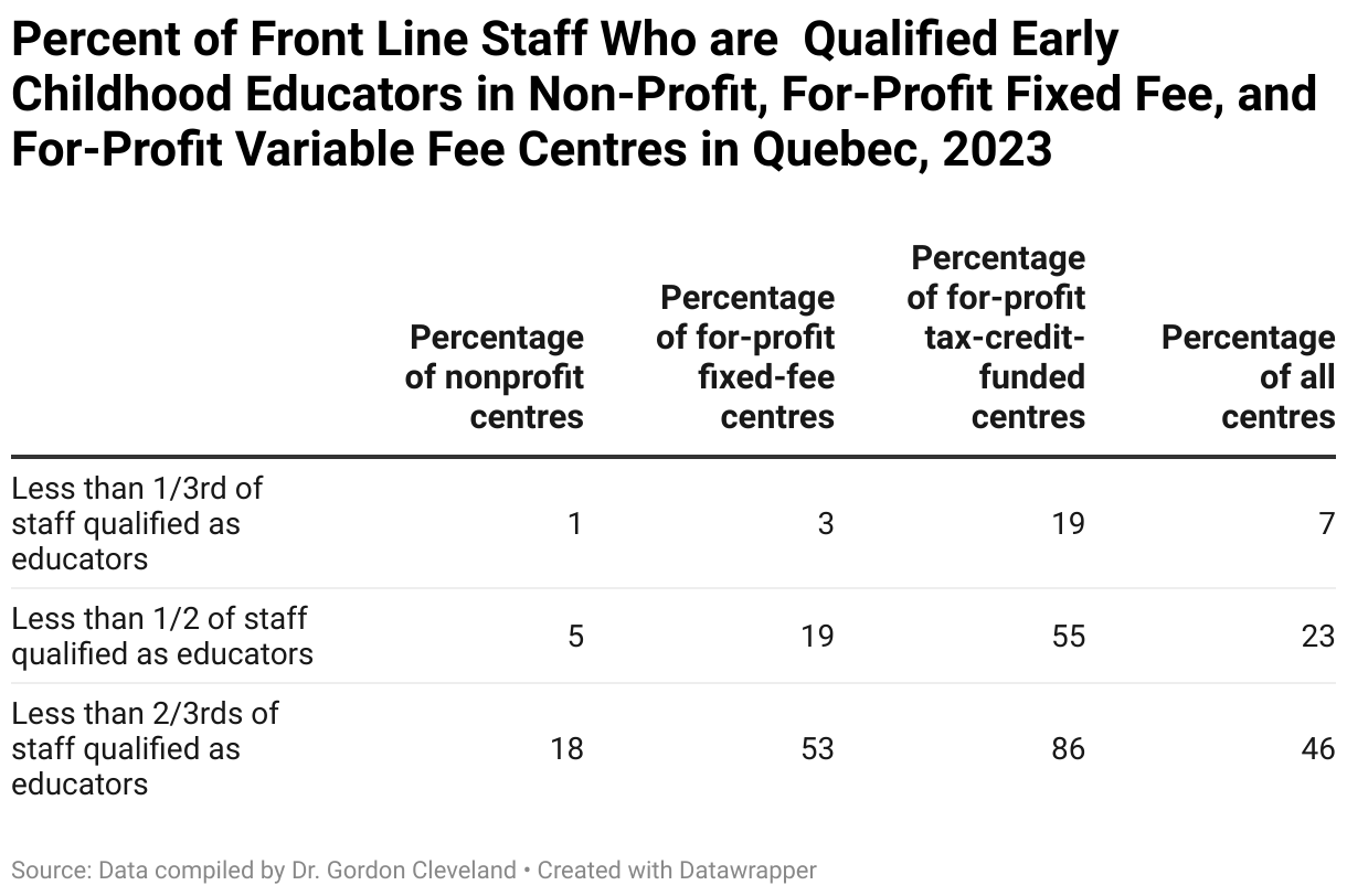 As you can see, the nonprofit centres score much better on the percent of early childhood educators than either of the for-profit categories. Shockingly, 19 per cent of the for-profit tax-credit-funded centres do not even have one out of every three staff qualified as an early childhood educator. Over half of these centres do not meet the currently required ratio of one half of staff being early childhood educators. And 86 per cent of these for-profits do not meet the two thirds requirement that Quebec has been trying to re-establish.