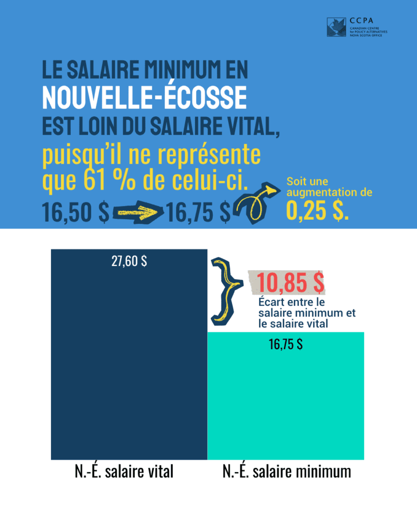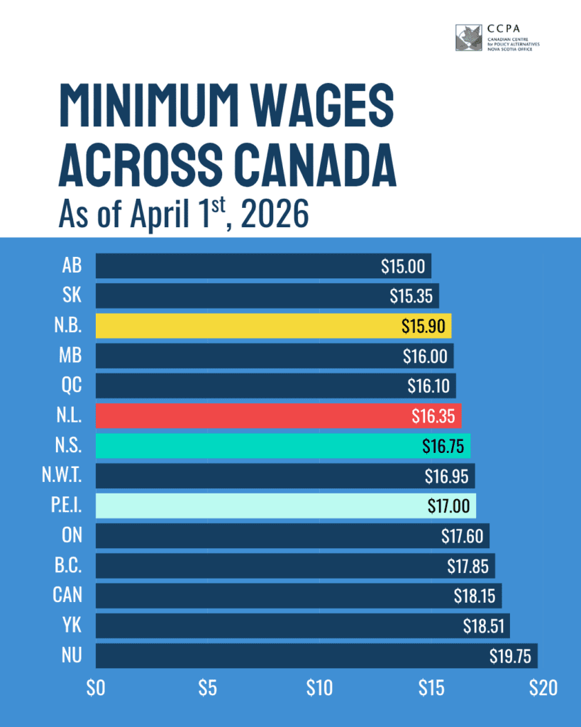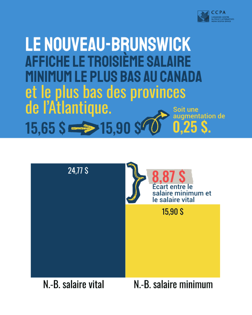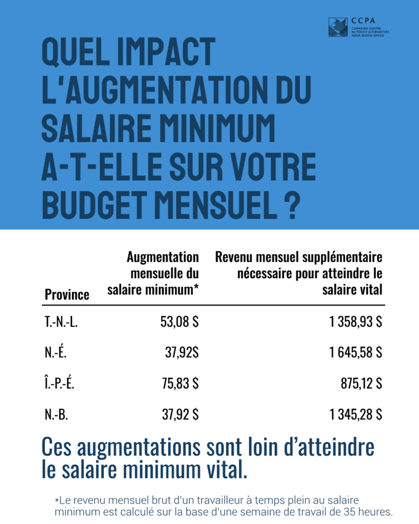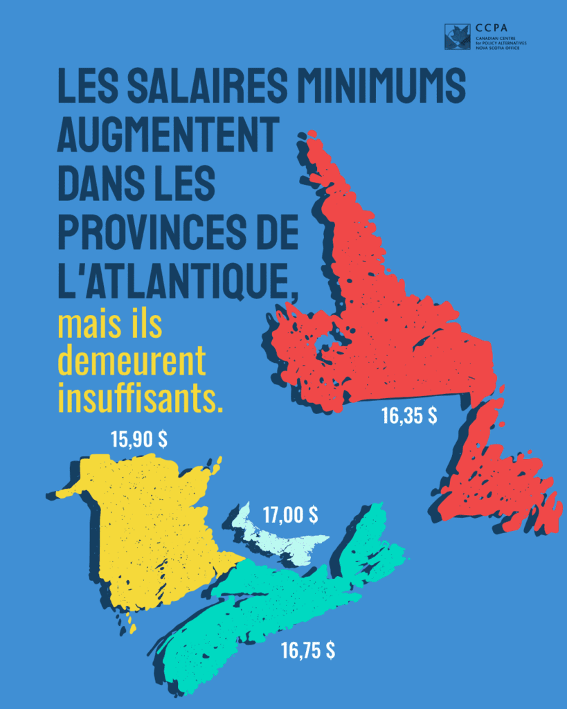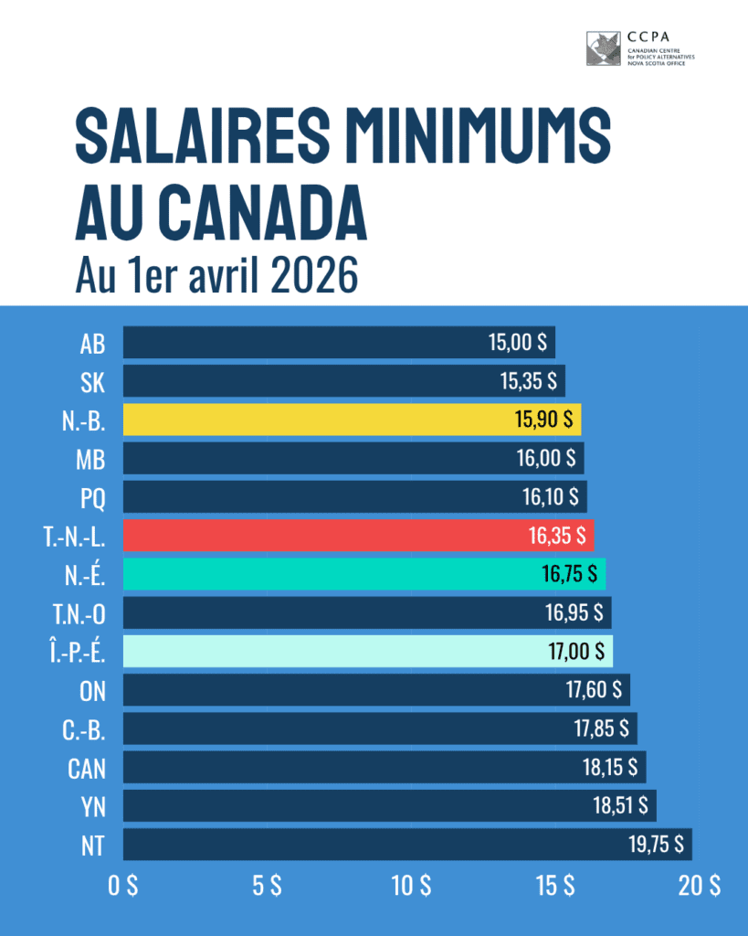 KJIPUKTUK/HALIFAX – Le salaire minimum augmentera demain, le 1er avril, dans toutes les provinces de l’Atlantique. L’Île-du-Prince-Édouard affichera le salaire minimum le plus élevé de la région, passant de 16,50 $ à 17,00 $ l’heure. Le Nouveau-Brunswick conserve le salaire minimum le plus bas de la région et le troisième plus bas au Canada, passant de 15,65 $ à 15,90 $ l’heure. Malgré ces augmentations, les salaires minimums dans la région demeurent bien en deçà du salaire vital provincial.