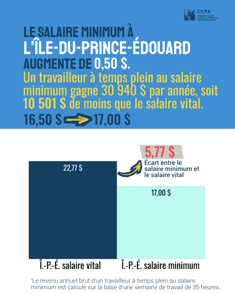 - L’augmentation du salaire minimum à l’Île-du-Prince-Édouard ne représente toujours que 75 % du salaire vital de l’Î.-P.-É. (22,77 $). L’écart annuel entre le salaire minimum et le salaire vital est de 10 501 $.