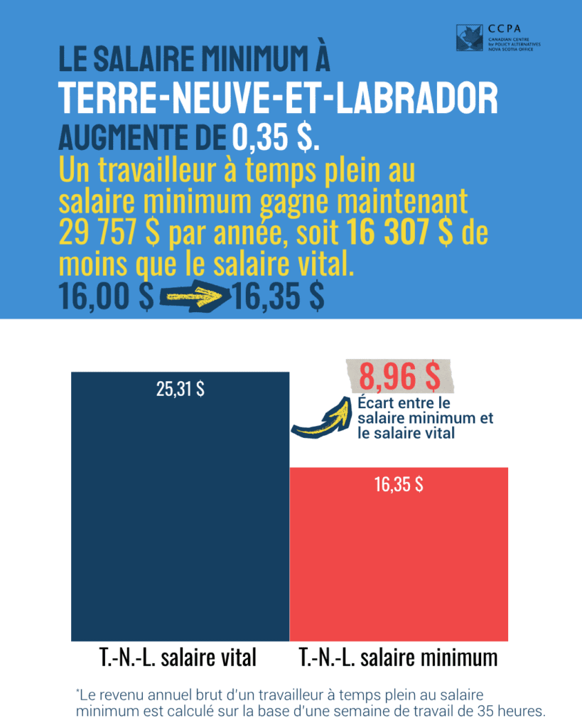 - À Terre-Neuve-et-Labrador, le salaire minimum passe de 16,00 $ à 16,35 $, soit une hausse de 2,2 %. Ce salaire minimum est inférieur de 8,96 $ au salaire vital de Terre-Neuve-et-Labrador, qui est de 25,31 $. L’écart annuel s’élève à 16 307 $.