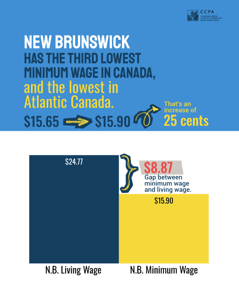 - New Brunswick’s living wage is $24.77, meaning that the minimum wage is $8.87 below the living wage ($16,143 annually).