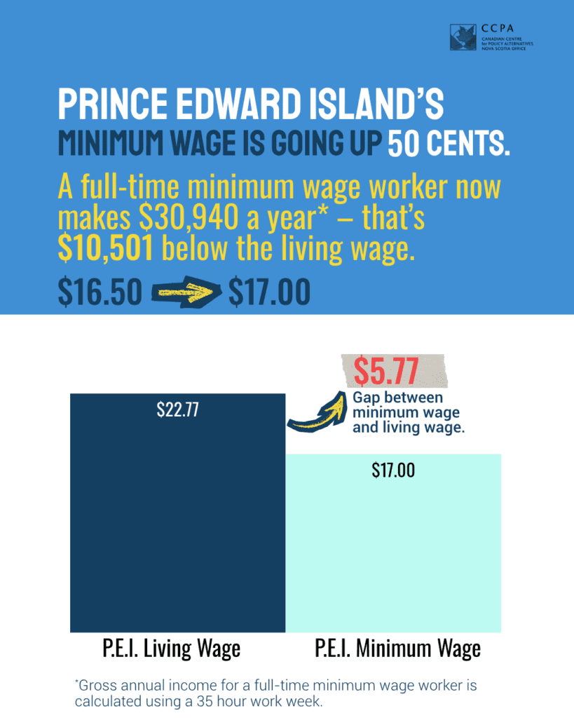 - The increase to Prince Edward Island’s minimum wage still only makes up 75 per cent of P.E.I.’s living wage ($22.77). The annual gap between the minimum wage and the living wage is $10,501.
