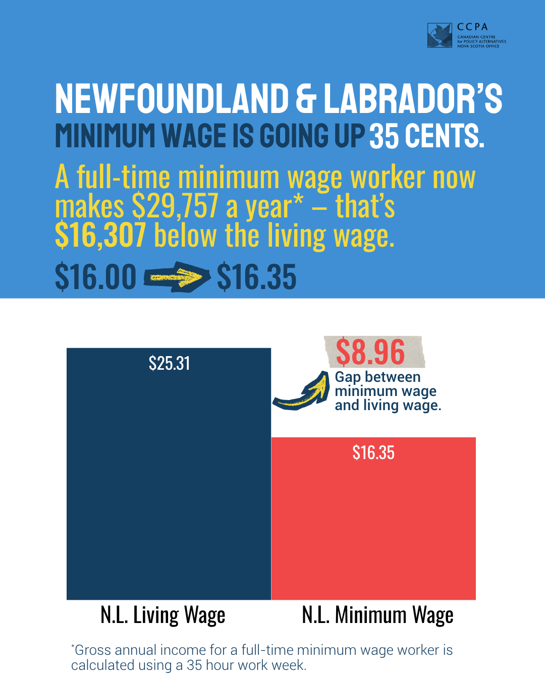 - In Newfoundland and Labrador, the minimum wage is increasing from $16.00 to $16.35 – a 2.2 per cent increase. This minimum wage is $8.96 below Newfoundland and Labrador’s living wage at $25.31. Annually, this is a gap of $16,307.